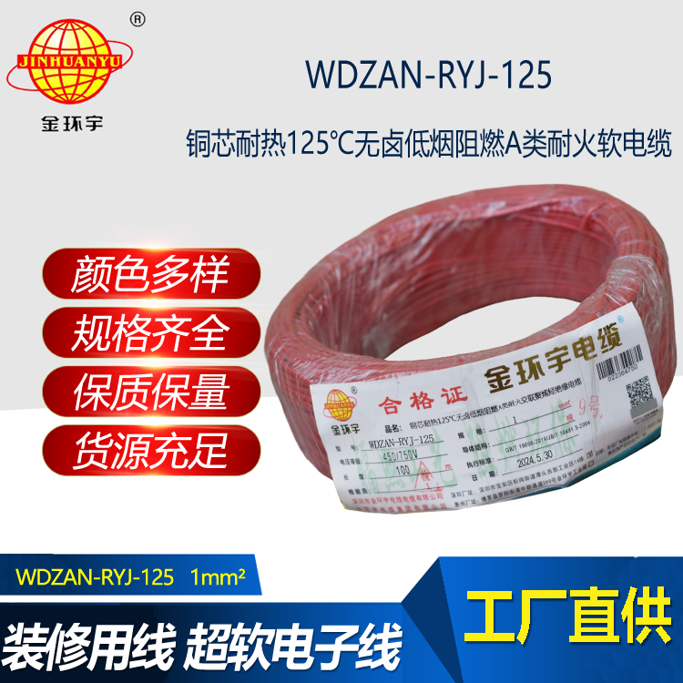 金環(huán)宇電線電纜 a級阻燃耐火無鹵低煙電線WDZAN-RYJ-125耐熱1平方電子線