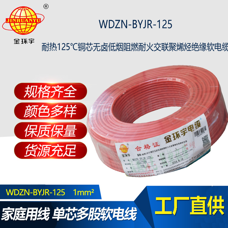 WDZN-BYJR-125是一種交聯(lián)聚乙烯新型裝修的布電線(xiàn)。WDZN-BYJR-125布電線(xiàn)的特點(diǎn)就是低煙量、無(wú)鹵素、阻燃、耐火。每個(gè)字母代表的意思:W代表無(wú)鹵;D代表低煙;Z代表阻燃;N代表耐火;125代表溫度可達(dá)到125℃,YJ代表交聯(lián)聚乙烯絕緣;R代表軟。其導(dǎo)體主要是銅線(xiàn),有薄的絕緣層和良好的電氣機(jī)械性能,以及耐熱、防潮、耐溶劑等性能,選用不同的絕緣材料可獲得不同的特性。