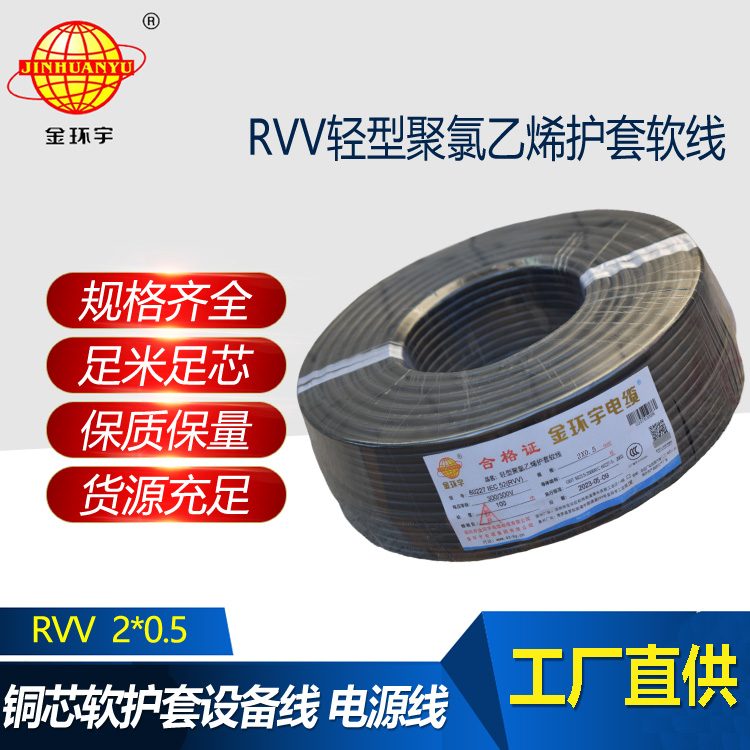 RVV2*0.5平方電纜是2根0.5平方銅芯交聯(lián)聚乙烯絕緣聚氯乙烯護(hù)套電力電纜,帶阻燃特性。阻燃—ZR 阻燃A類,阻燃B類,阻燃C類。金環(huán)宇電線電纜產(chǎn)品上千種,歡迎來電咨詢。